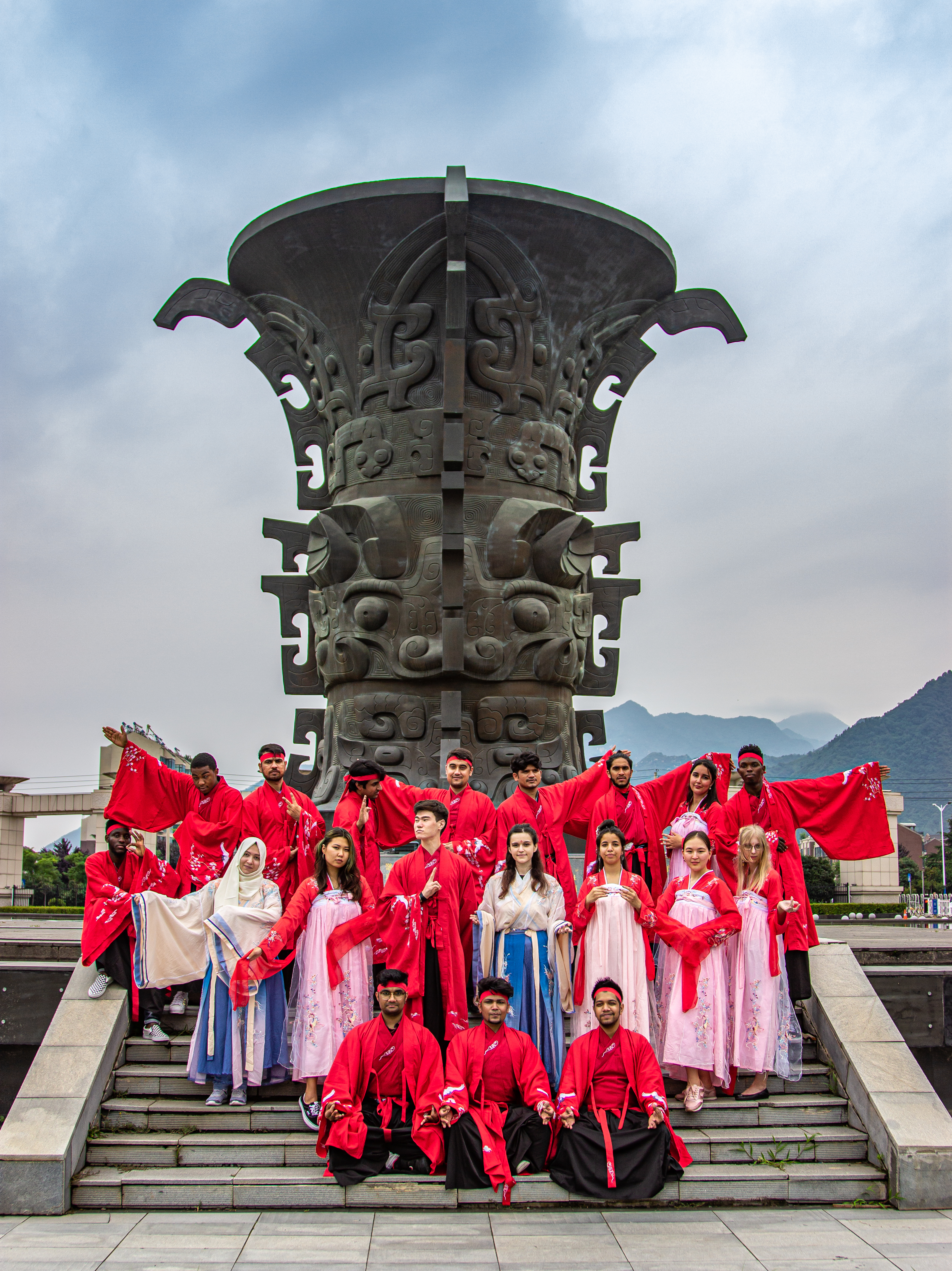 下午,留学生们在校园里穿汉服拍毕业照。身着汉服的留学生本身也是校园内一道靓丽的风景。最后参与活动的全体留学生在何尊雕像下共同吟诵校歌“中华灿烂,工大无疆”,给此次活动一个完美的结尾。