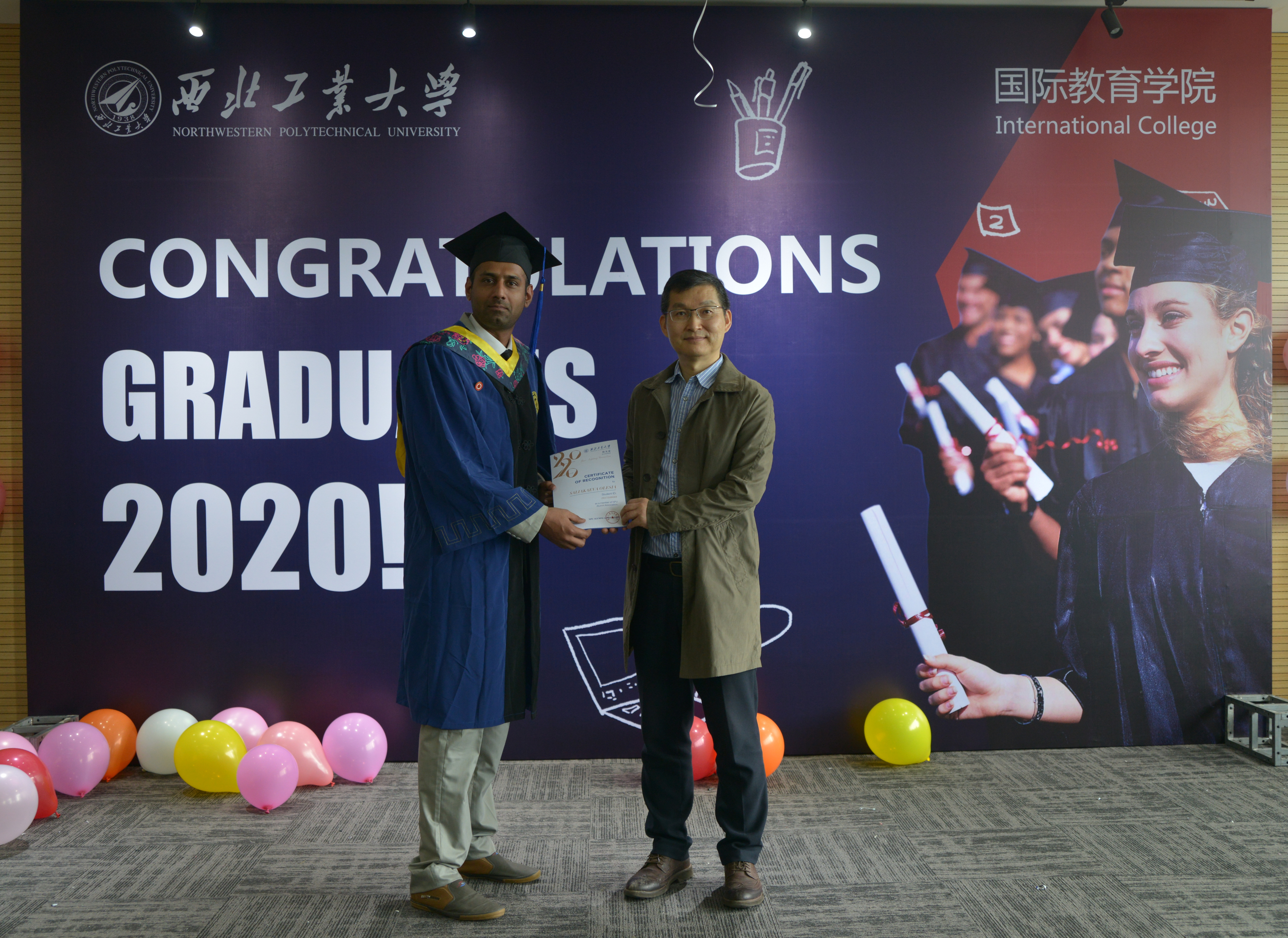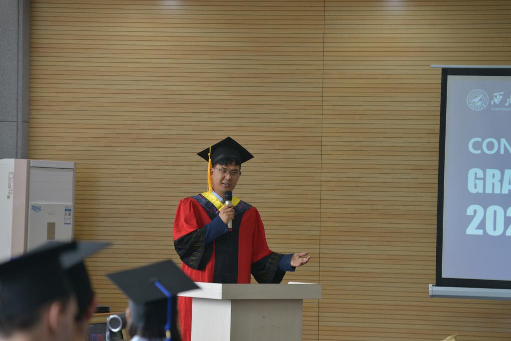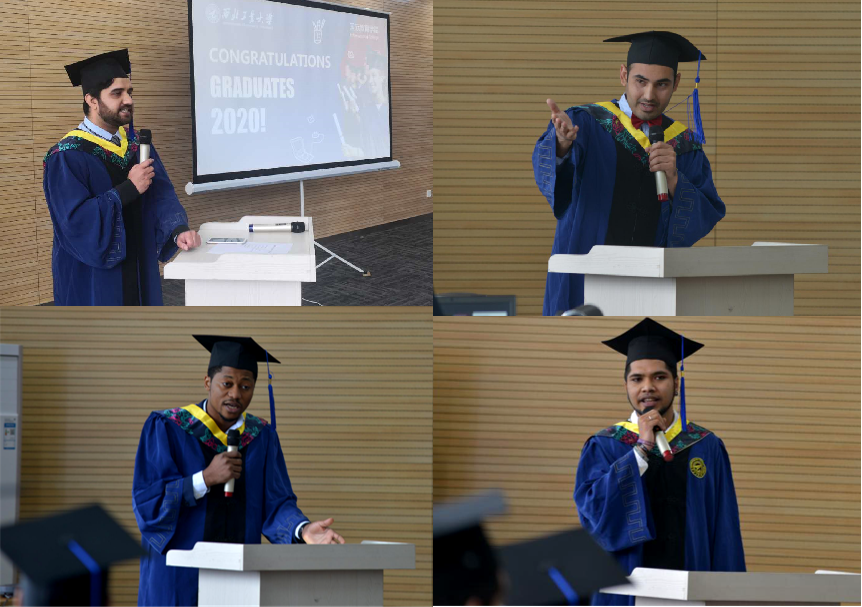 巴基斯坦籍机电学院硕士HAIDER ALI、巴基斯坦籍自动化学院硕士TANVEER ALI、加纳籍人文与经法学院硕士ARTHUR JAFARO和孟加拉籍航空学院硕士AKASH NIKUNJUN SARKER 等4名毕业生,作为本届毕业生代表,分享了各自在西工大求学阶段的感悟和体会,表达了对老师、和同学的感激,留下了对母校的不舍与留恋。