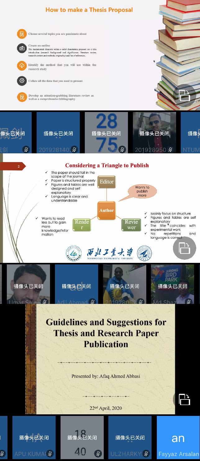 4月22日下午,国际教育学院组织召开“研学在线”优秀学生分享会,邀请在学术研究、论文发表方面表现突出三名硕士、博士研究生,围绕“Suggestions on Publishing a Thesis(SCI) and Writing A Master Final Dissertation”的主题,通过线上会议的方式,为留学生坚持“停课不停研”提供指导,分享各自在学术论文发表、学位论文撰写等方面的经验与建议,提升学术论文写作水平。国际教育学院留学生管理办公室四名研究生辅导员和70余名身处世界各国的西工大留学生一起聆听分享。会议还未开始,很多留学生已经进入会场等候。
