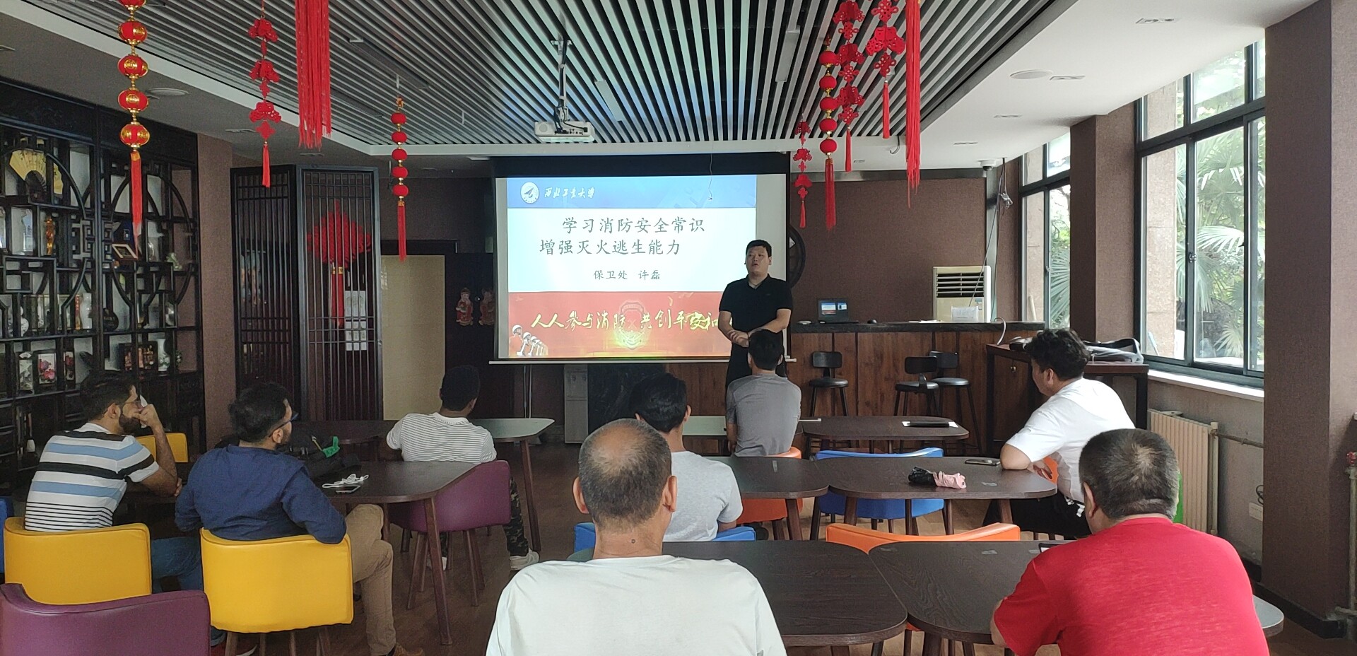 为提高我校留学生的消防安全意识,普及消防安全知识,预防火灾事故的发生,6月25日下午,国际教育学院邀请保卫处许磊老师面向留学生和公寓工作人员开展了消防安全知识专题讲座及消防演练活动。
