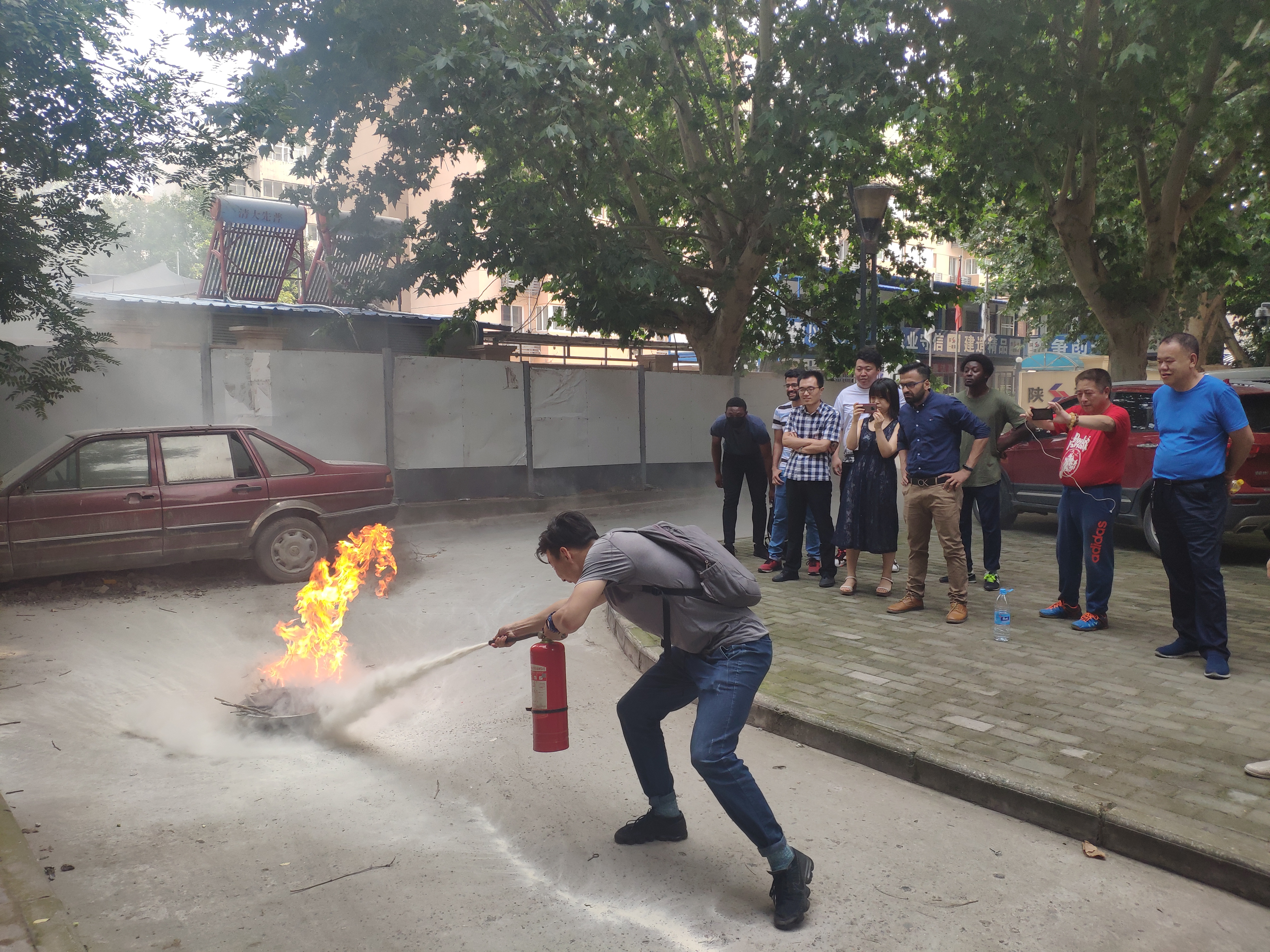 在顺利完成疏散演练后,保卫处老师实地操作和示范了消防安全器材的使用方法。在场的师生们也通过实际操作,掌握了灭火器的正确用法。