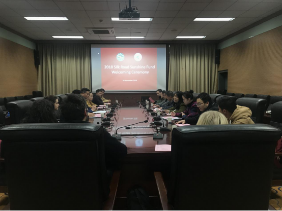2018年11月29日下午,由我校和丝绸之路国际总商会合作培养的首届“丝绸之路阳光基金”项目留学生开学典礼在长安校区数字化大楼第一会议室召开。丝绸之路国际总商会副秘书长李强,管理学院党委书记李小聪,国际教育学院院长助理袁云,校友总办公室(教育基金会办公室)孙卫丽,以及12位来自6个国家的新生参加了开学典礼。