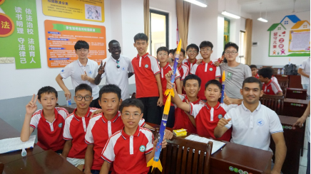 图为实践队员与融水县思源实验中学学生制作火箭合影