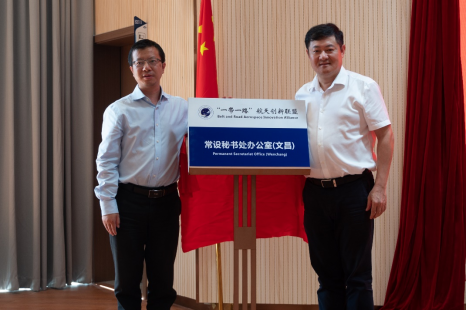 图为文昌国际航天城管理局副局长王广智和德赢·vwin体育国际合作处副处长陈俊为“一带一路”航天创新联盟常设秘书处办公室(文昌)揭牌