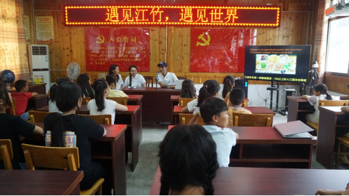 “遇见江竹,遇见世界”,实践队员们来到江竹村党支部开展交流活动,观看江竹村脱贫攻坚工作纪实视频,分享各国特色文化,为江竹的孩子们打开了认识世界的大门。