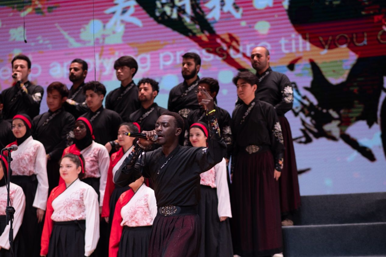国际教育学院合唱队选择励志感人、奋进向上的《孤勇者》作为演唱曲目。历经近两个月的刻苦练习,克服友谊、长安两校区双线同步排练的困难,最终在舞台上发挥出色,用激扬歌声唱出正能量,唱出面临困境默默坚守、砥砺前行的昂扬斗志,表演期间不断赢得了观众们的惊叹喝彩与阵阵掌声,体现了新时代在华留学生昂扬向上的精神风貌。