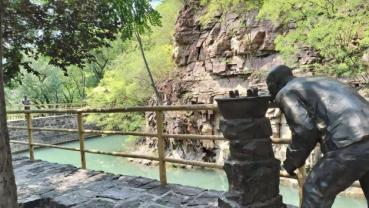实践队员沿着蜿蜒的渠道,身旁流淌着林县人民用血汗引来的渠水,看着悬崖上修渠人一锤一钎劈开山体、凿出的山洞,真切领略了“劈开太行山,漳河穿山来”的工程成果。一尊尊雕塑演绎着修渠群众众志成城,一座座石碑描绘着渠成引水泽被后世,实践队员驻足雕塑与石碑,感受新中国劳动人民的“开天辟地”的昂扬斗志。老照片《凌空除险》最是令人难忘,实践队员都惊叹于建设者不畏艰险的顽强意志。