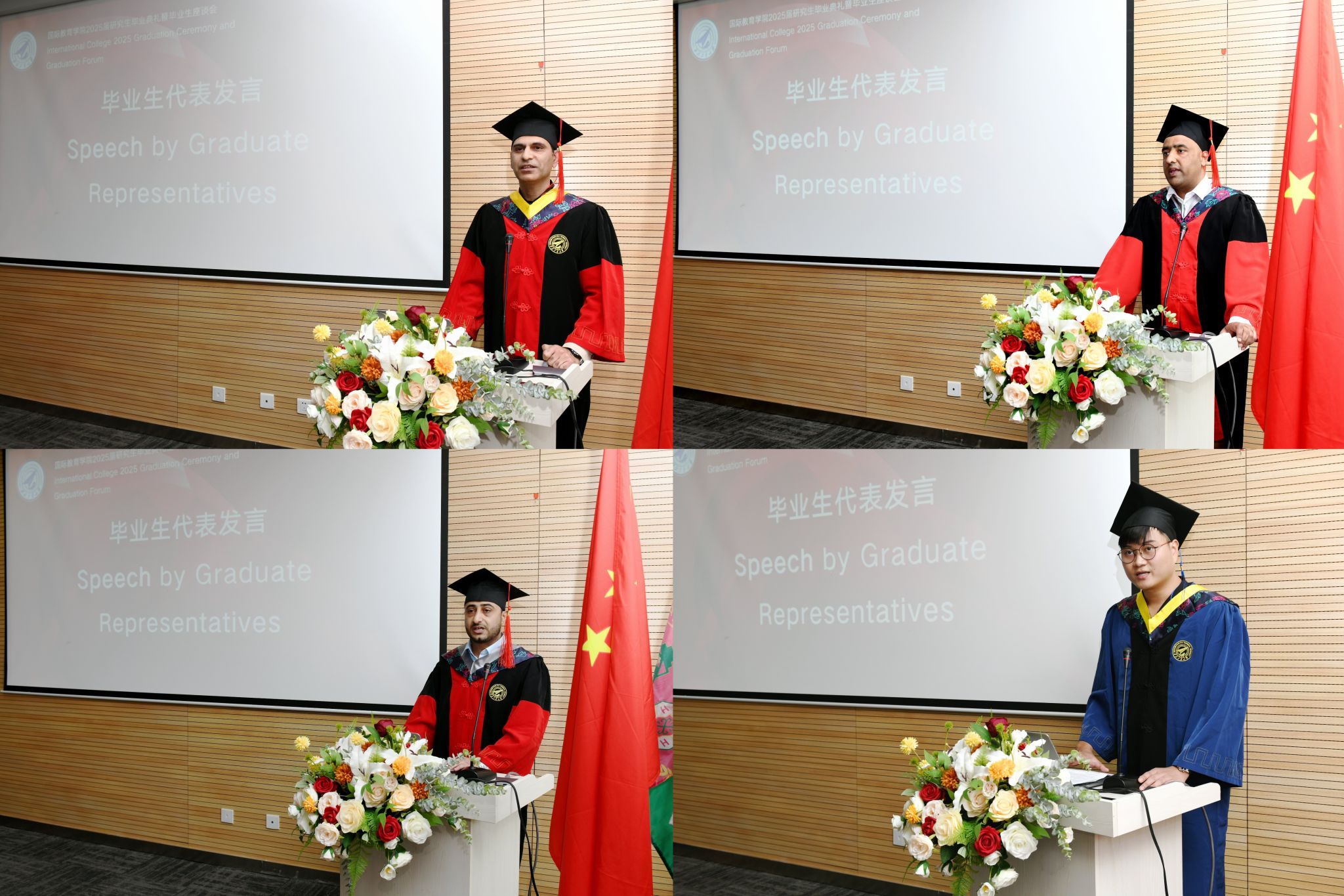 毕业生代表MUHAMMAD ATIF, AL-KHAZZAN ABDULWASEA MOHAMMAD ALI ALI, SAYED MURAD ALI SHAH, BUN THEAVUTH KETEKUN依次发言,他们真挚分享了自己在西工大的学习经历、成长感悟以及对未来的憧憬,表达了对母校、老师和同学的感恩之情,现场气氛温馨感人。