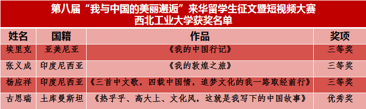 此外,在第八届 “我与中国的美丽邂逅” 大赛成果展示及颁奖典礼环节中,我校共有4名留学生荣获三等奖3项、优秀奖1项,相关指导教师获“优秀指导教师奖”,学校荣获大赛“院校优秀组织奖”。