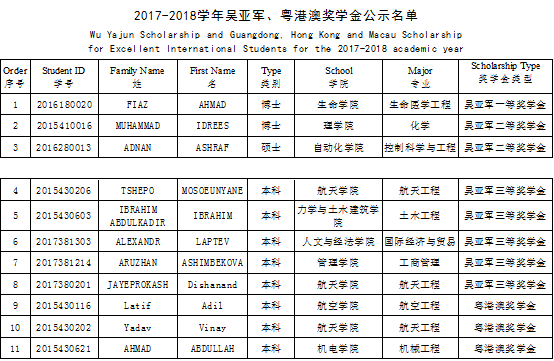 经个人申请,院系审核,学院评审,拟确定我校11名留学生为2017-2018学年吴亚军、粤港澳奖学金候选人,名单附后。为体现公平、公正、公开的原则,现予公示3天,时间为2018年11月1日—2018年11月3日。如有异议,请于11月3日下午4点之前以书面形式到国际教育学院留学生管理办公室反映,电话:88495735。邮箱:iso@nwpu.edu.cn