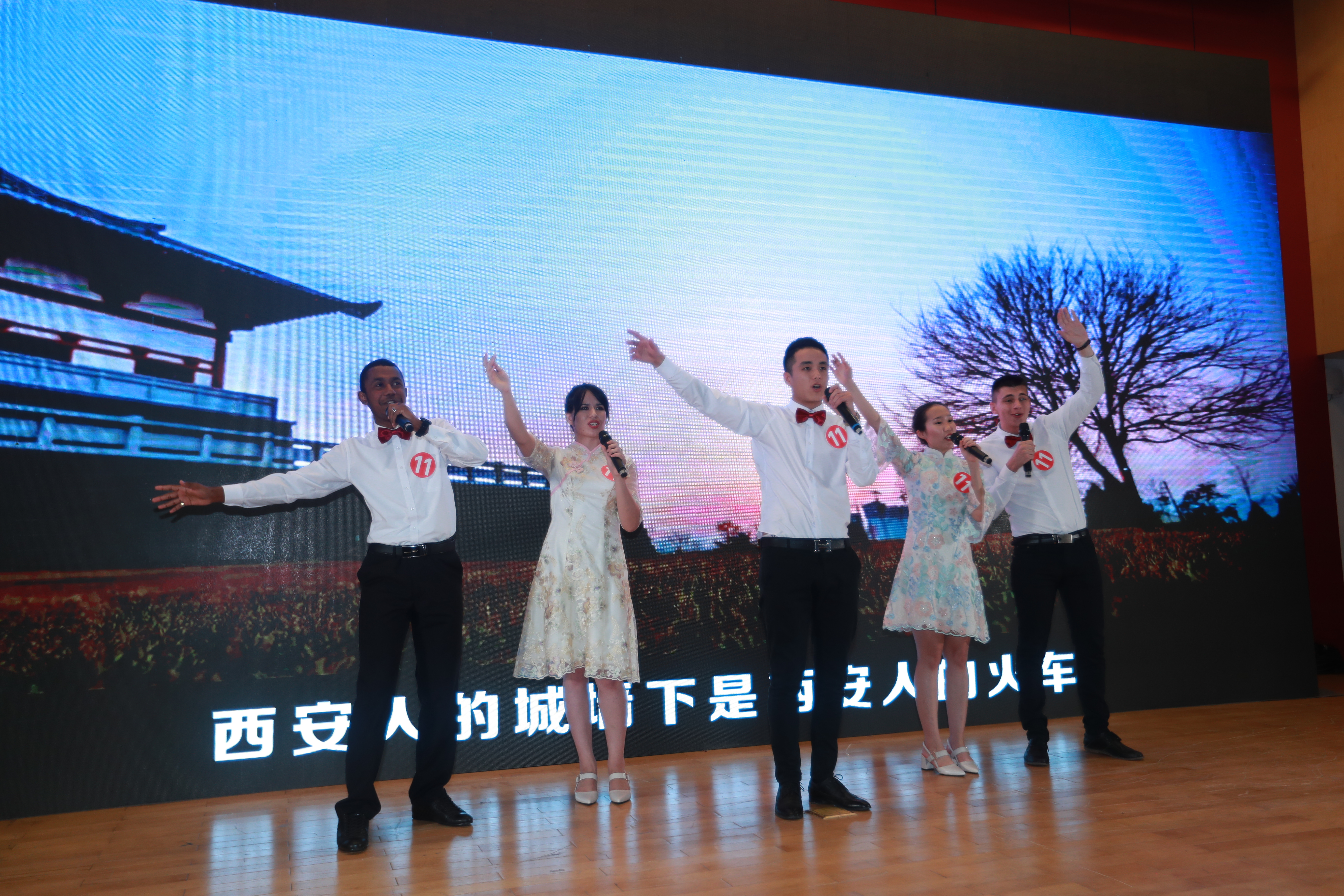 我校参加本届比赛的是马赞、杰克、大山、安娜、沙娜五位留学生,他们为大家深情演绎了一首诗朗诵《爱上长安》。五位留学生立足于他们在西安(即诗歌中的长安)生活的所见所闻,用优美的语言将长安的景、长安的古、长安的人、长安的新娓娓道来,也将他们对长安这座城市的爱尽情表白。诗歌结尾处,他们用西安方言为大家演唱了一段描写西安风情的《西安人的歌》,现场热烈的气氛让观众感觉仿佛已经置身于千年古都的繁华中。五位学生大方从容、真挚深情的表演得到了专家评委的一致赞许,而他们仅仅学习汉语半年时间就达到如此高的水平也令在场的师生深为叹服。