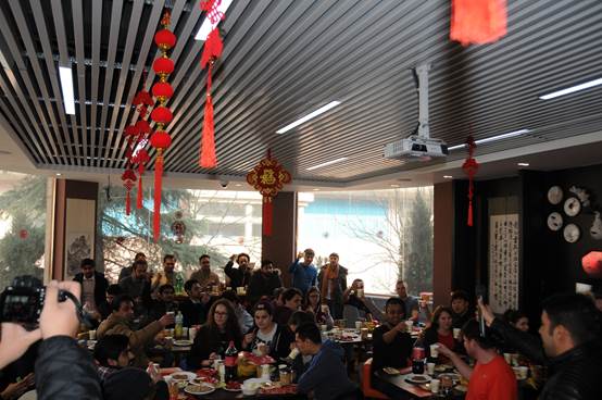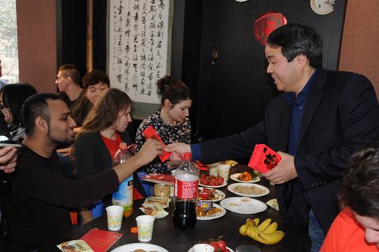 聚会上,留学生们还学说了“新年快乐”“恭喜发财”等吉祥话。有的留学生现学现用,马上向老师讨要起了红包。这套路来得猝不及防,李东红老师笑着给大家发放了红包,送上了“最诚挚”的新年祝福。