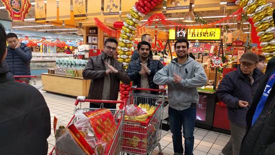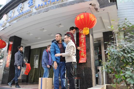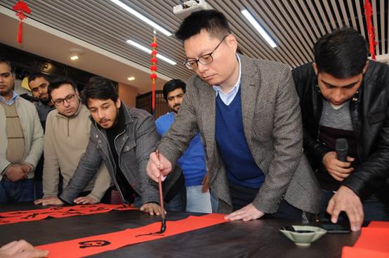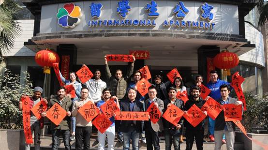 犬守平安日,梅开如意春。2018年2月14日,国际教育学院组织在校留学生一起庆祝中国传统新年。今年寒假留校的留学生有近三百人,为了丰富他们的假期生活,也为了让留学生更好地了解中国文化,这次新年Party设置了购年货、贴春联、贴福字、发红包等活动,还特别邀请了陕西书法家张辉前来给留学生教写春联。