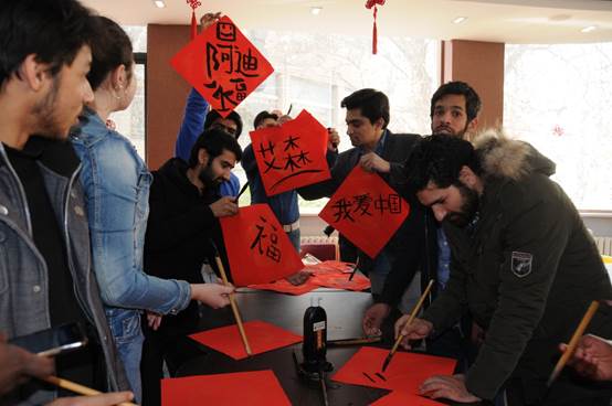 在Party上,张辉老师挥毫泼墨,展示了中国书法的魅力,同时介绍了中国春联的历史以及“福”字的由来。留学生们摩拳擦掌、跃跃欲试。他们提起毛笔,不太娴熟地写下了“我爱中国”“新年快乐”“福”“寿”等祝福语。虽然笔迹略显笨拙,但是祝福真挚感人。