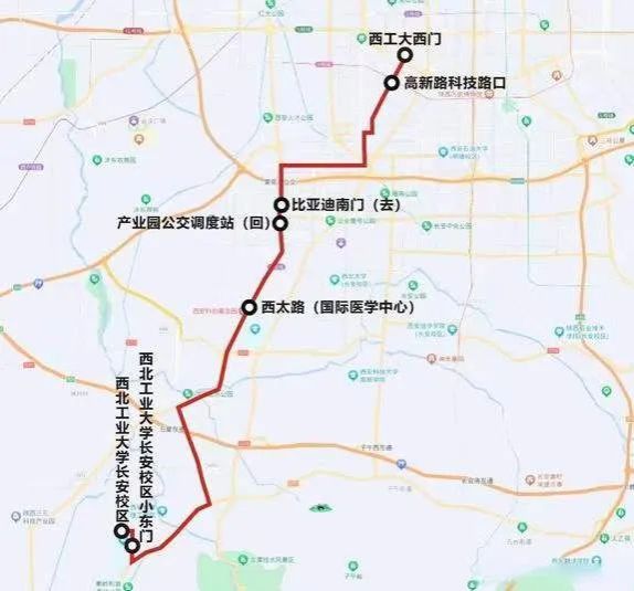 线路设置站点7个:德赢·vwin体育长安校区、德赢·vwin体育长安校区小东门、西太路(国际医学中心)、比亚迪南门(去)、产业园公交调度站(回)、高新路科技路口、西工大西门。