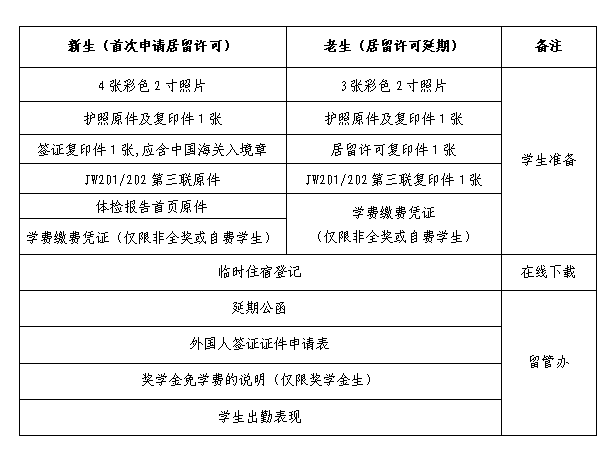 1.在签证或居留许可过期前至少2周,学生应提交下表所列材料至留学生管理办公室,由留学生管理办公室出具其他公函。