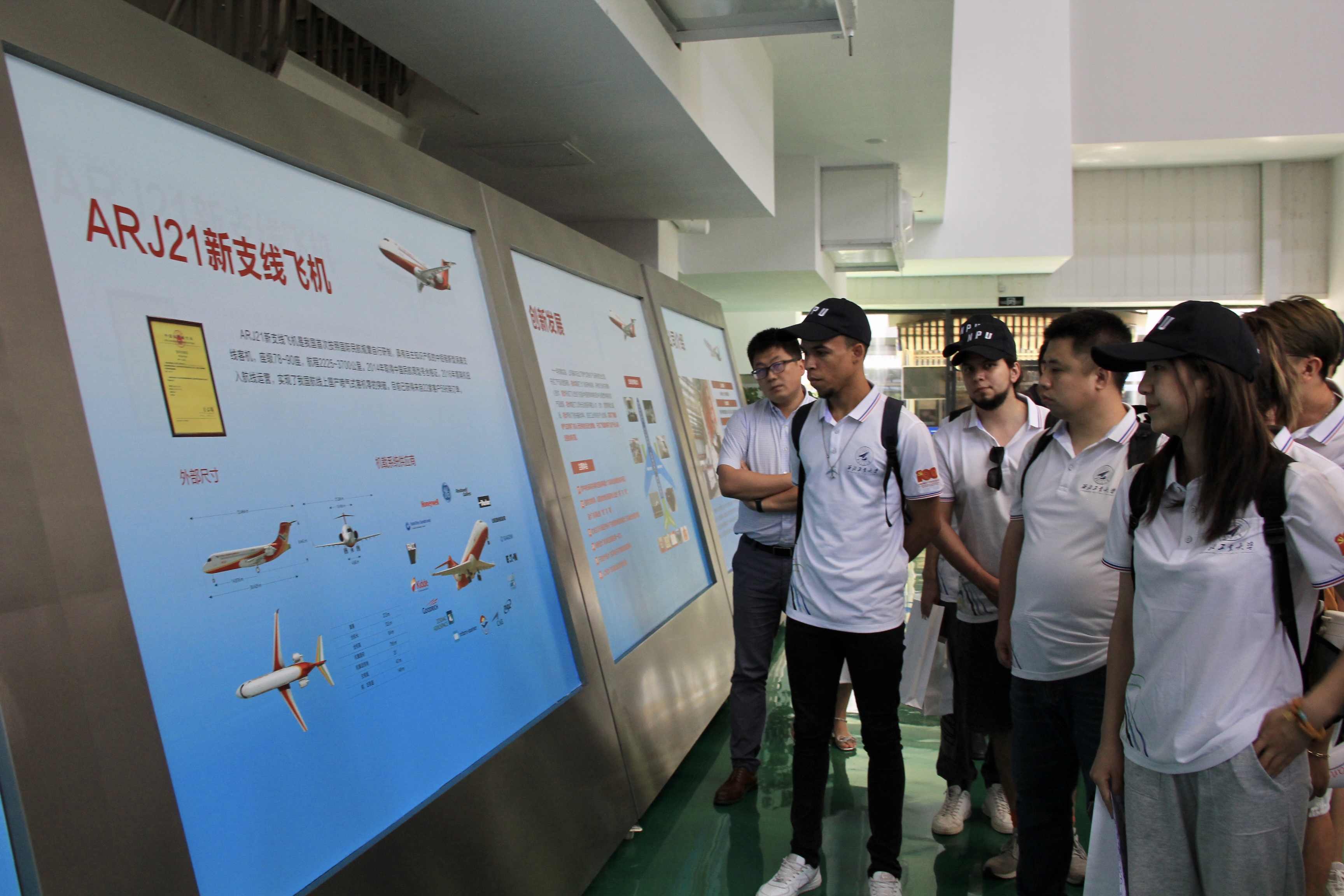 在中国商用飞机有限责任公司,聆听运10飞机的发展历程,走过航空前辈们的奋斗之路,远观C919航电实验室、近察ARJ21总装生产线,中外学生了解到大飞机作为衡量国家航空工业水平的重要依据,其研发现状和能力需求。